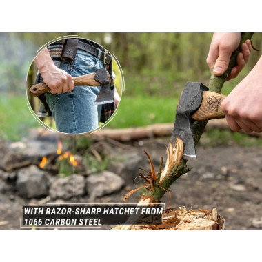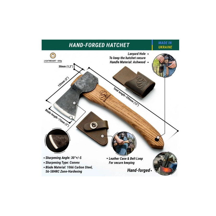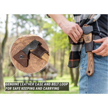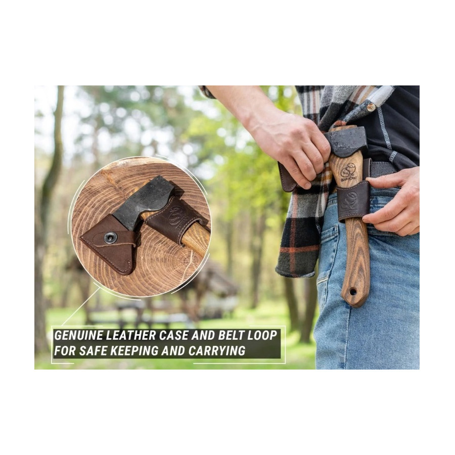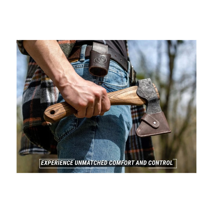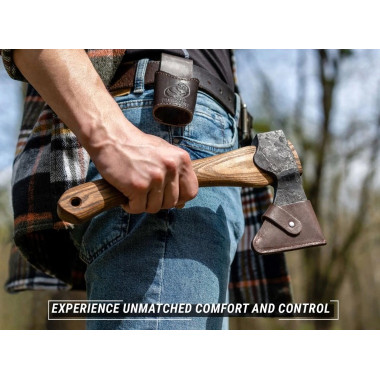 Rukoväť smerom k hlave sekery hrubne, čo zabezpečuje pevnejší a stabilnejší úchop. Sekera sa dodáva s koženým chráničom ostria a pútkom na opasok