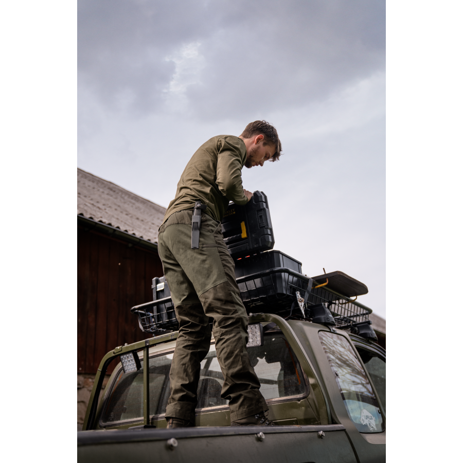 Pevné nohavice Härkila vhodné na lov, poľovníctvo aj outdoor aktivity. Nohavice majú dve vrchné predné vrecká a dve vrchné stehenné vrecká na zips