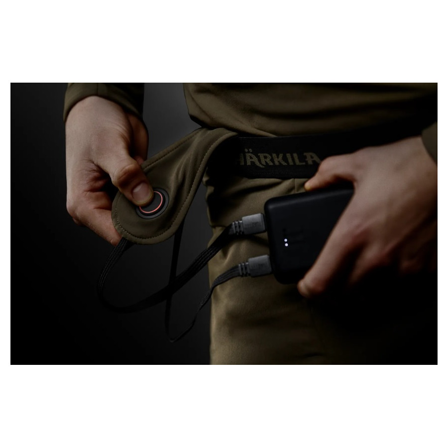 V páse je dlhý, látkou potiahnutý kábel s vodotesnou USB zástrčkou, takže môžete pripojiť powerbanku s požadovanou kapacitou, ktorú si môžete nechať napríklad vo vrecku nohavíc.